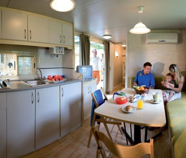Deze zeer fraai ingerichte Camping Norcenni Girasole Club Toscane Italie MobilhomesĀ (type Giotto) zijn eigentijds en zeer stijlvol ingericht en beschikken over 2 slaapkamers, 1 met een 2-pers. bed en 1 met een stapelbed en 1-pers. bed, een badkamer met douche en wastafel en afzonderlijk toilet, een woongedeelte met een sofa, tafel met stoelen, airco, verwarming en een goed uitgeruste keuken met o.a. koelkast (met vriesvak) en gasfornuis.
