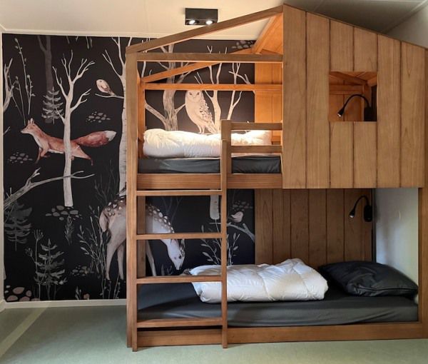 Deze ruime kindvriendelijke Vakantiepark De Katjeskelder Oosterhout Noord-Brabant Bungalow type K6KV Comfort 6-personen is rookvrij en heeft op de begane grond een woonkamer, open keuken met alles wat u nodig heeft tijdens uw verblijf zoals een vaatwasser, combimagnetron, koffiecupapparaat en een waterkoker. Tevens op de begane grond een slaapkamer met badkamer, wastafel, inloopdouche en toilet. Op de 1ste etage zijn er 2 slaapkamers (1 met twee 1-pers. bedden en 1 met een boomhut stapelbed) en een badkamer met ligbad en toilet. Standaard is in deze bungalow een kinderledikant, commode en kinderstoel, -bad en -box aanwezig. De trap beschikt over traphekje onder en boven en de wandcontactdozen zijn afgeschermd. U kunt gratis gebruik maken van Wifi. Het terras is voorzien van tuinmeubilair en dit vakantieverblijf ligt vlakbij een speeltuintje.
