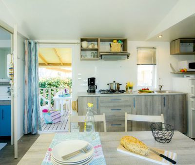 Deze mooie Camping Acapulco Saint-Jean-de-Monts Vendée Mobilhomes (type Cosy 5/6 personen) beschikken over 2 slaapkamers, 1 met een 2-pers. bed en 1 met twee 1-pers. bedden en een hoogslaper, een luxe badkamer met douche, wastafel en apart toilet, een woongedeelte met hoekbank, tafel, stoelen, en een goed uitgeruste keuken met gasfornuis, magnetron, koffiezetapparaat en koelkast.